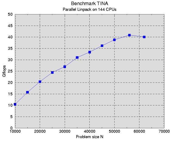 As a first test of Tina's performance we apply the well known Linpack benchmark. Linpack requires the solution of a system of N linear equations with N unknowns. There are several versions the Linpack benchmark, differing in size, numerical precision, and rules.