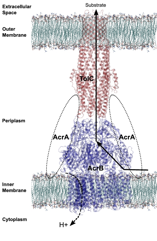 Bacteria, such as E. coli, use multidrug efflux pumps to export toxic