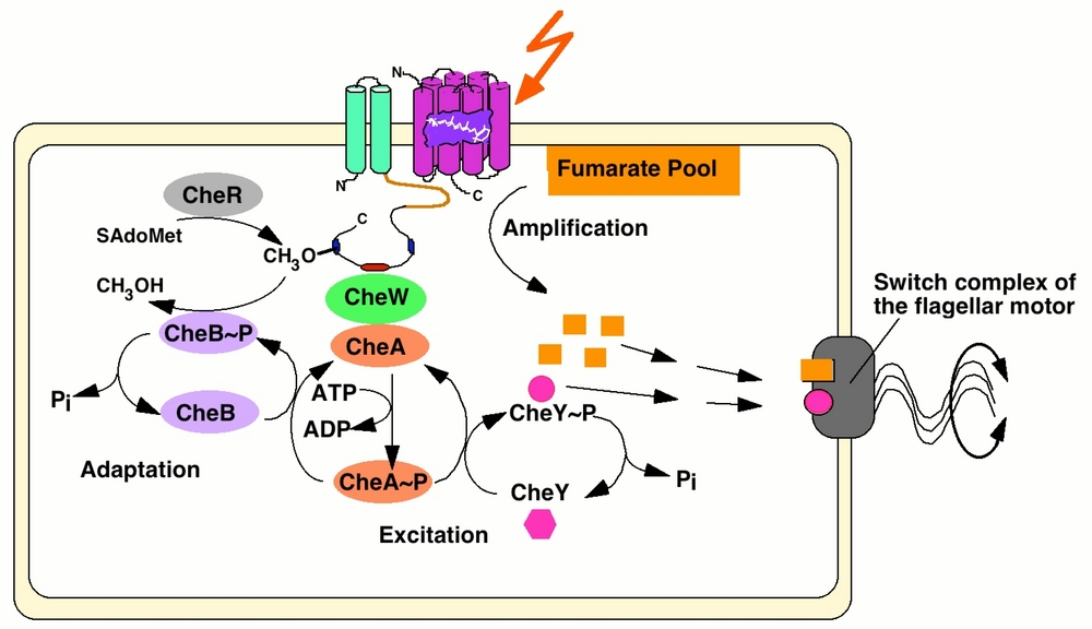 Sensory receptors feed into a core signal processing network composed of 11 cytoplasmic proteins which mediates signal integration, adaptation and motor response. Because the network is small and many molecular details are known, mechanistic questions related to receptor activation, functional cross-talk of receptors, or the biophysical chemistry of signal processing can be addressed at the single cell level.