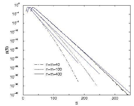 Here, a new method to calculate probability distributions in regions where the events are very unlikely is applied. The basic idea is to map the underlying model on a physical system. The system is simulated at low temperature, such that preferably configurations with originally low probabilities are generated. Since the distribution of such a physical system is known, the original unbiased distribution can be obtained. The result of the application to the sequence-alignment problem is shown in the figure.
